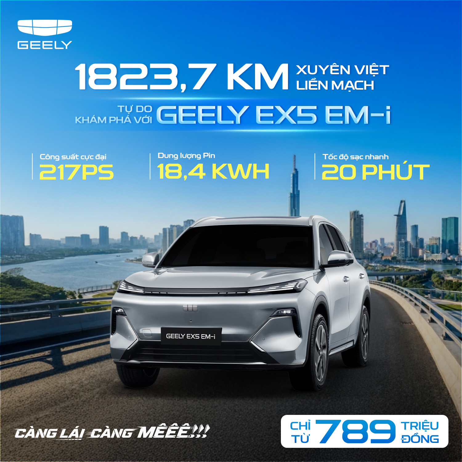1823,7 KM XUYÊN VIỆT LIỀN MẠCH, TỰ DO KHÁM PHÁ VỚI GEELY EX5 EM-i Hơn cả một con số, 1823,7 km là tuyên ngôn