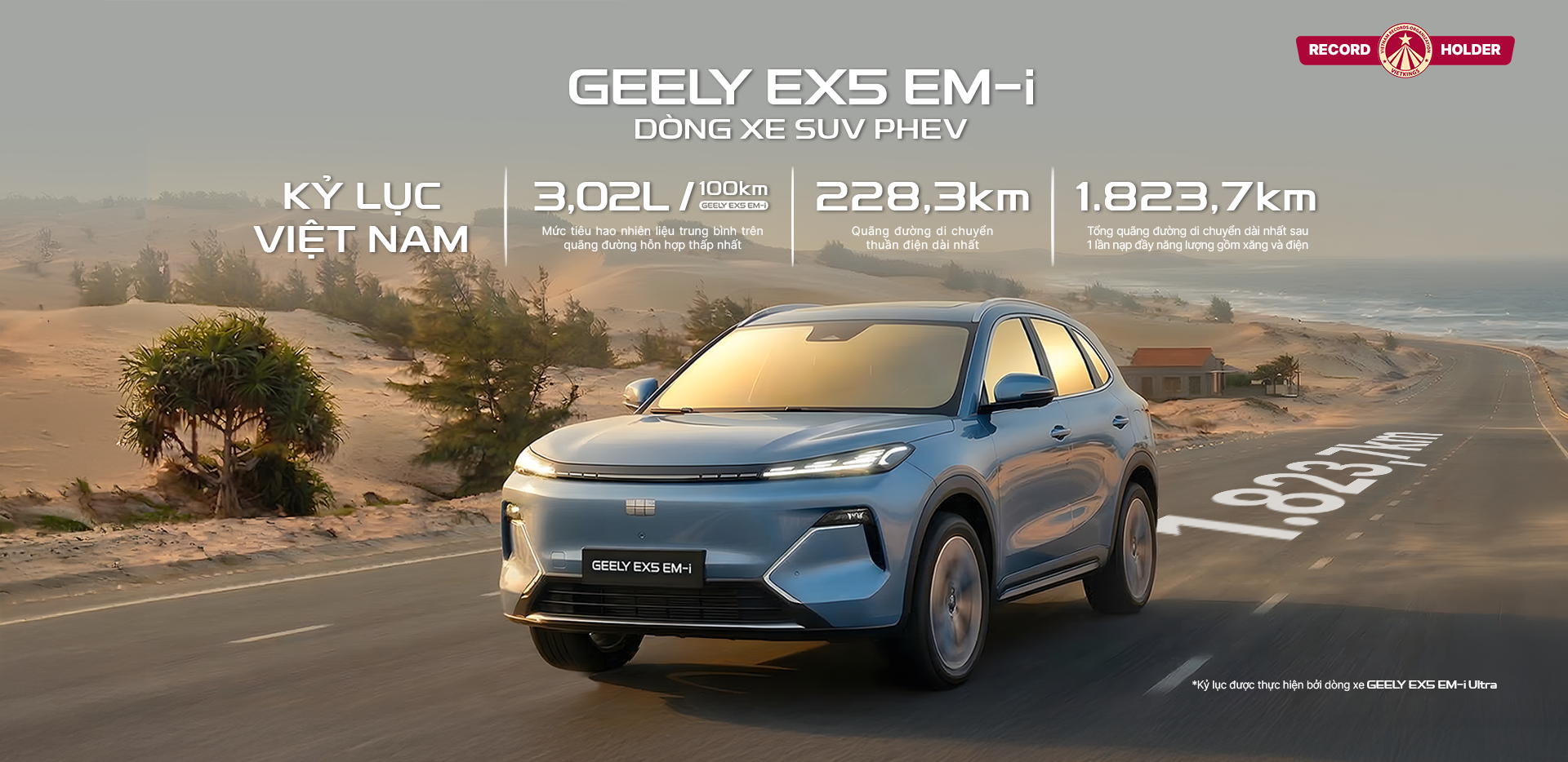 - Geely EX5 EM-i: Dòng xe SUV PHEV có quãng đường di chuyển thuần điện dài nhất (Khi tham gia thử thách thực tế tại Việt Nam đạt 228,3km)