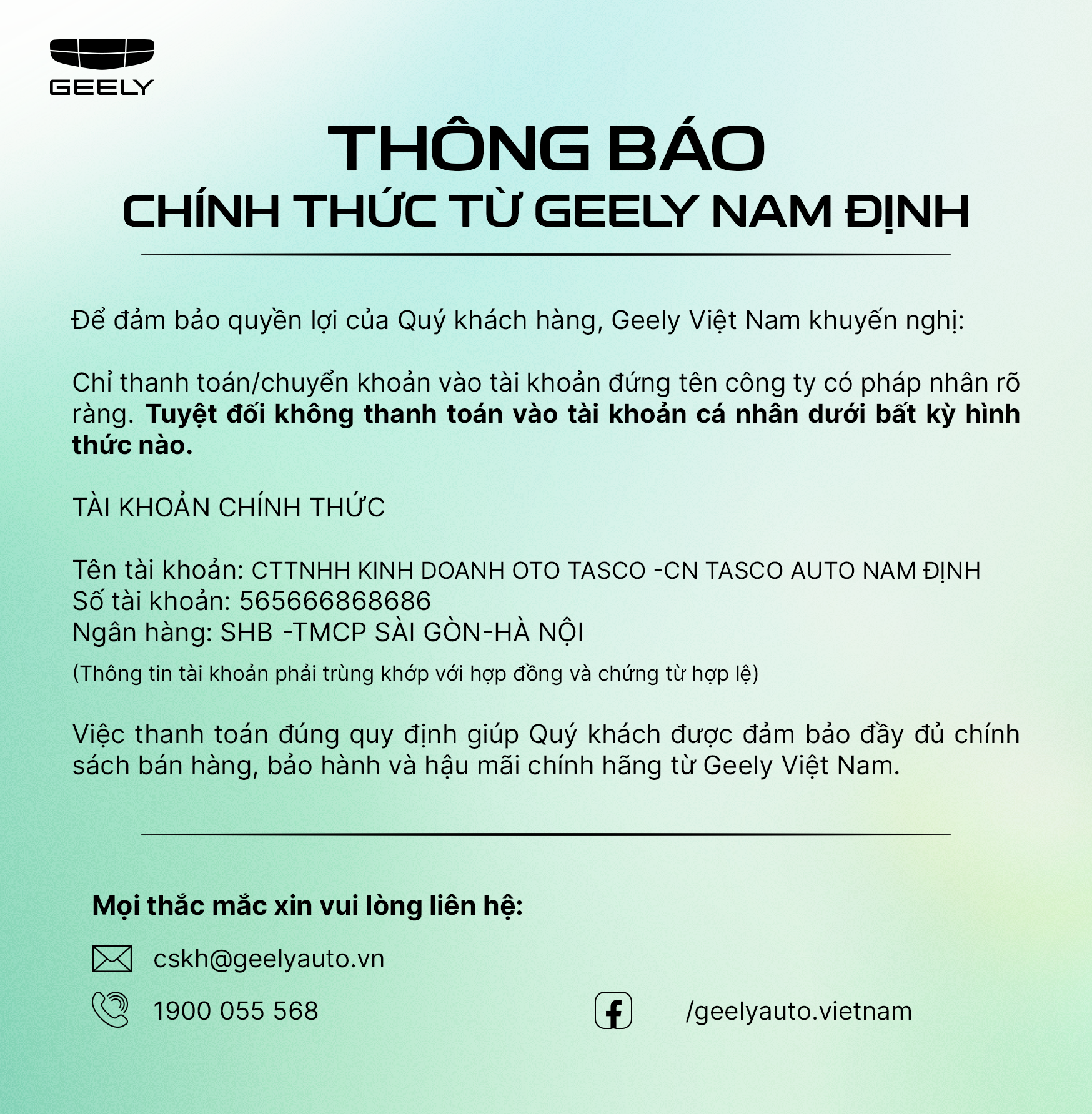 Nhằm đảm bảo minh bạch trong giao dịch và bảo vệ tối đa quyền lợi của Quý khách hàng, Geely Nam Định trân trọng khuyến nghị: